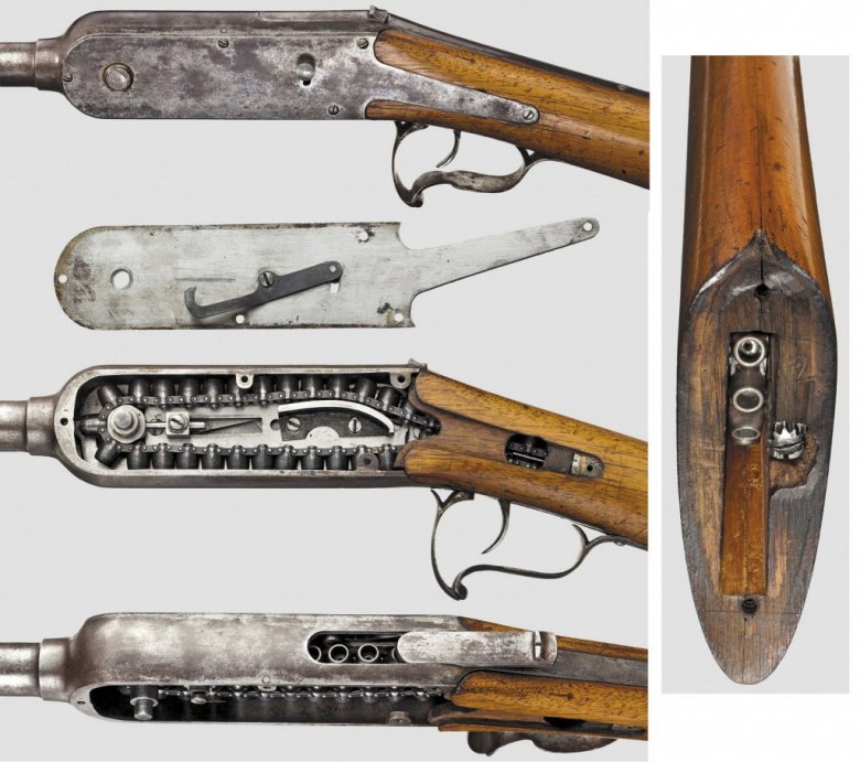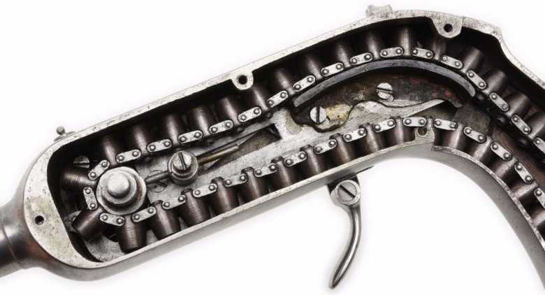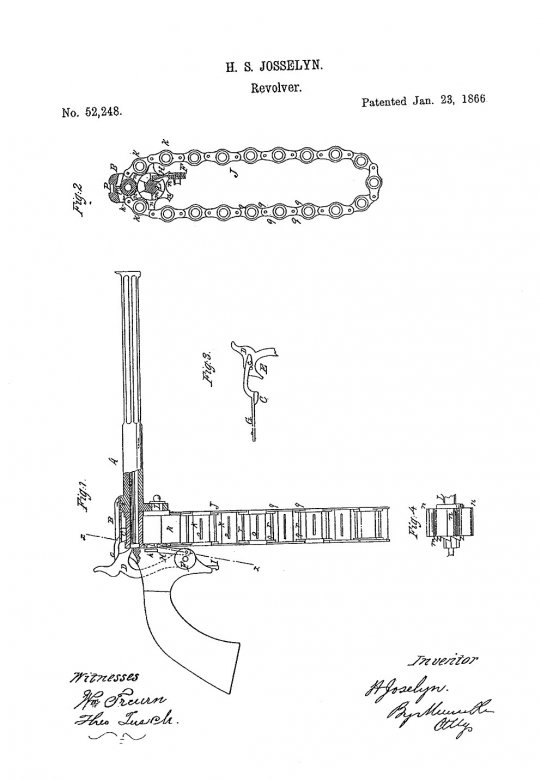 Применение цепи для подачи боеприпасов в оружии не было чем-то необычным и новым. Вот к примеру графическая часть патента №52248 Генри Джоселлина от 23 января 1866 года, где в оружии, напоминающем револьвер, использована цепь для размещения патронов.