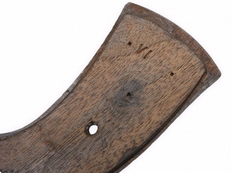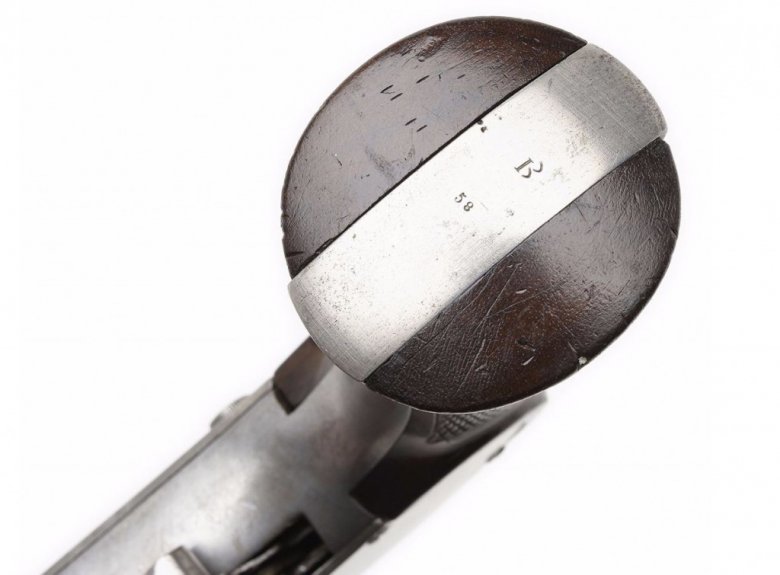 Щечки рукоятки пистолета Гайкота (Guycot Chain Pistol) изготовлены из ореха. Их наружные поверхности могут быть гладкими или с ромбовидной насечкой. Щечки крепятся к основанию рукоятки с помощью винта. На внутренней поверхности щечки рукоятки, показанной на фото, видна вдавленная римская цифра «VI».