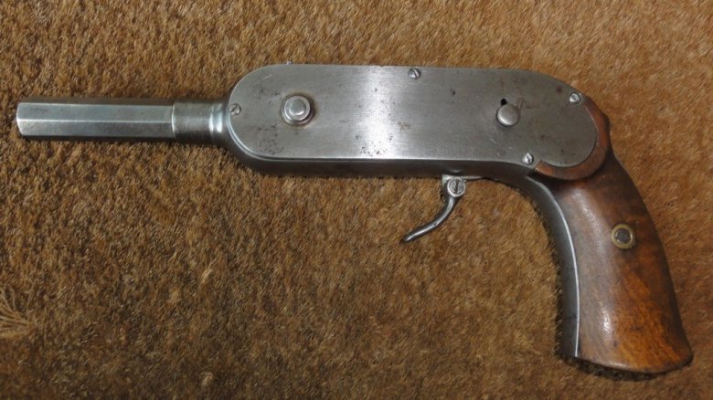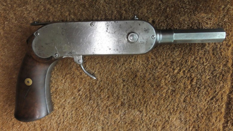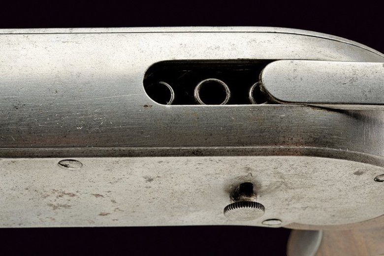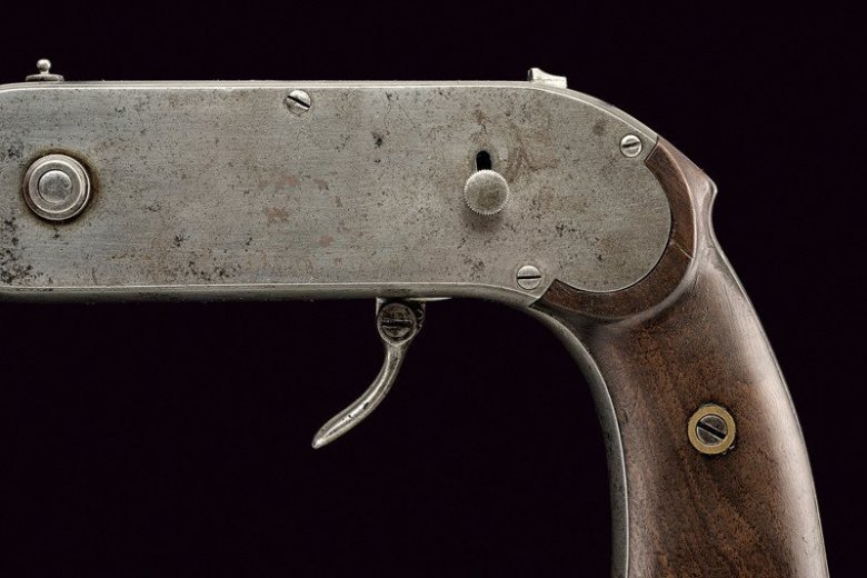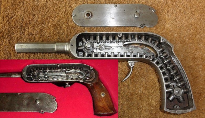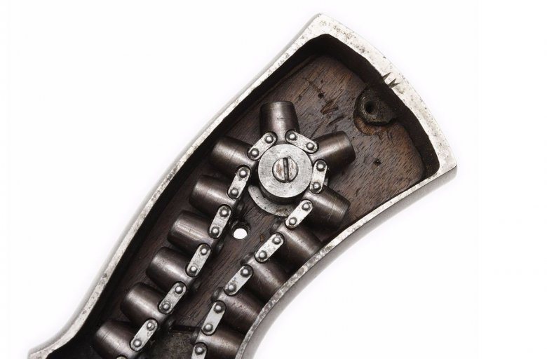 Внутри рамки пистолета размещена цепь, которая удерживает 40 камер (чашечек). Данные камеры предназначены для заряжания специальными пулями. Пули в хвостовой части имеют полость, в которой размещен заряд из соли гремучей кислоты или мощного пороха. Заряд в пуле закрывает тонкая оболочка, покрытая лаком, защищающим метательный заряд от влаги. Подобные по общей конструкции пули использовались в американском пистолете Вулканик (Volcanic).