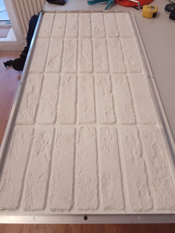 По поводу сколько с мешка можно сделать м2 пока ответить не могу, весов к сожалению нету. Но судя по всему, он получается легче и возможно тут с мешка получится около 10м2. А это считайте 50р за м2 готового декоративного кирпича из гипса!