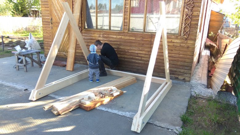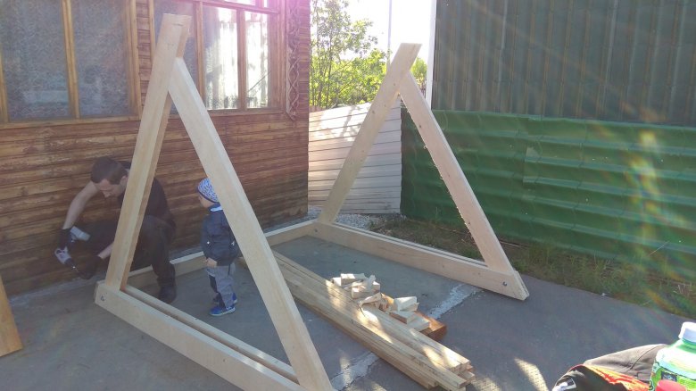 Собираем каркас, все углы пилил на глаз, никаких спецприборов, только такая то матерь, почему ты не сходишься, а тут я лишнего отпилил, говорили же семь раз отмерь, один отрежь и в таком духе... Сын учится: