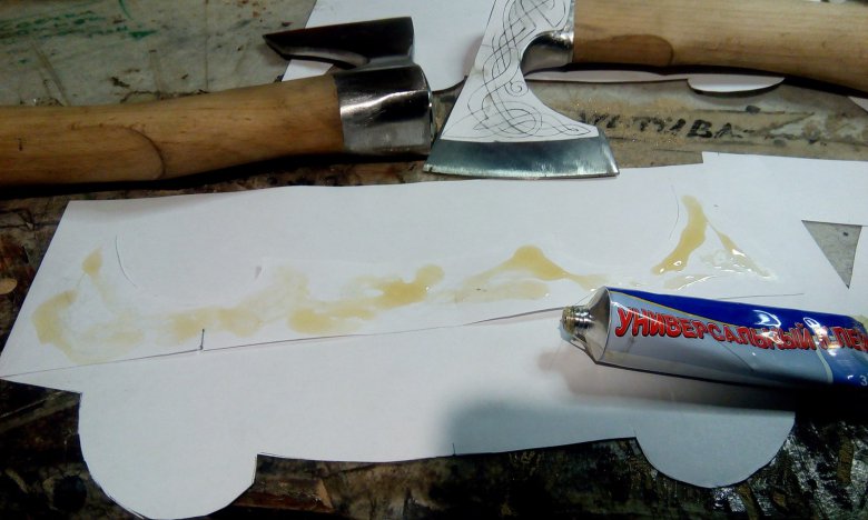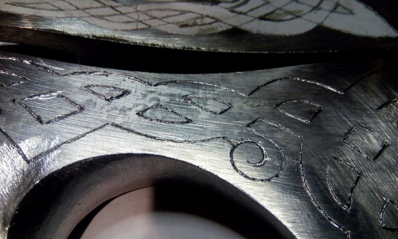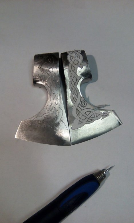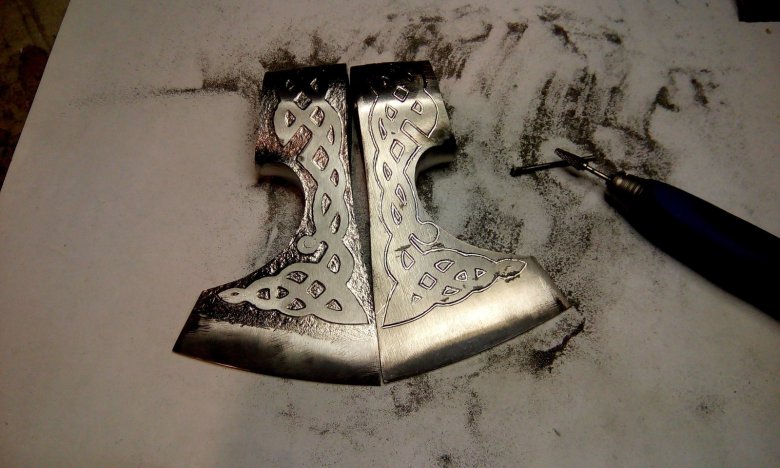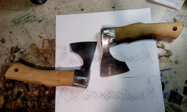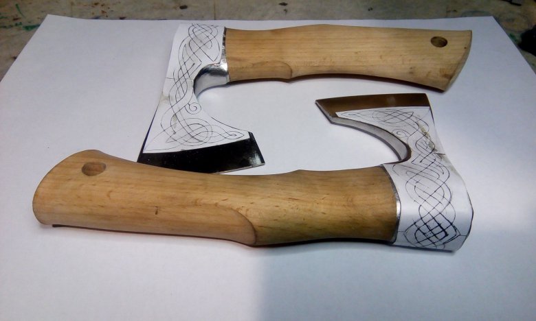 На топоры была нанесена гравировка. Муж придумал орнамент, вписанный в силуэт топора. Сделал с него две ксерокопии, вырезал и приклеил на металл.