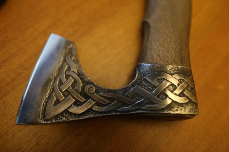 Металл топора был затемнен в декоративных целях с помощью травления, а потом отполированы до зеркального блеска рисунок и режущая кромка. В сочетании с тёмным фоном гравировка приобрела объём.