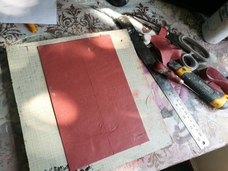 Рабочую поверхность присыпаем тальком, чтобы в процессе ничего смертельно не прилипало, и можно было двигать пласт, не деформируя его. Не рекомендую заменять тальк чем-то еще типа муки. Зернистость талька меньше. Нужно совсем чуть-чуть! Раскатываем пласт и подрезаем прямоугольник. Я всегда делаю предварительный шаблон из обычной бумаги. Удобно — положил и отрезал по линейке. Толщина базы у меня стандартно 3-4 мм. Больше не нужно, и без того уходит приличное количество глины. Если у вас будет ярко выраженный рельеф или штамповка на фоне, то берите больше. В общем, отталкивайтесь от своих целей. Но очень толстый слой я все равно не рекомендую делать — значительно увеличится вес блокнота.