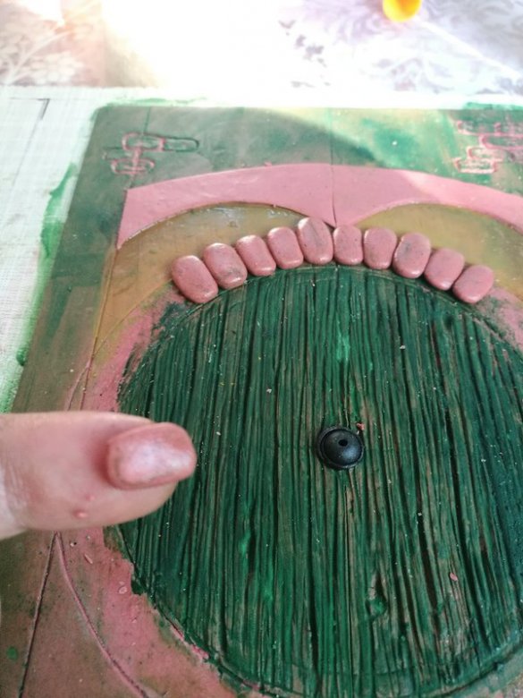 Моя толщина пласта позволила не делать дополнительную накладку для самой двери. Кроме того, здесь я решила отойти от своего святого правила и не делала полузапек базы. Во-первых, у меня достаточно простая композиция, и можно не бояться, что форма поплывет. Во-вторых, глина у меня уже подсушенная и хорошо держит форму. Во всех остальных случаях — и я писала об этом ранее — рекомендую после отрисовки эскиза на пласте отправить его в печь на полузапек. Так вы спасете себя от плывущей геометрии во время работы с рельефом. Для сцепки элементов с полузапеченной базой не забудьте использовать жидкий гель.