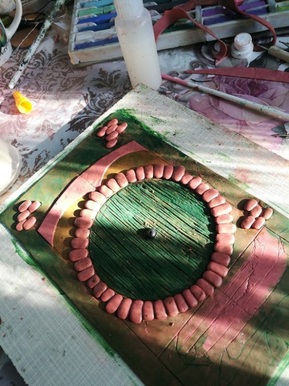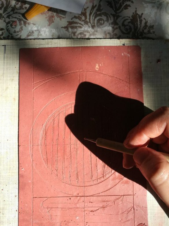 Прежде чем начать лепить, необходимо установить маяки. Прочертить все оси симметрии, отметить серединки. После этого прорисовываем круг будущей двери, отступы для кирпичиков вокруг двери и намечаем другие элементы. В этой работе их немного, поэтому предварительный эскиз я не делала. Если у вас сложная композиция, то лучше всего предварительно отрисовать ее на бумаге. Потом наложить эскиз сверху на раскатанный пласт и продавить иглой или шилом. На этом этапе будьте осторожны — не продавите пласт насквозь!