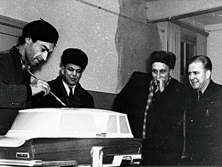 Юрий Андрос (крайний слева) за работой над масштабной (1:10) моделью «Старта».