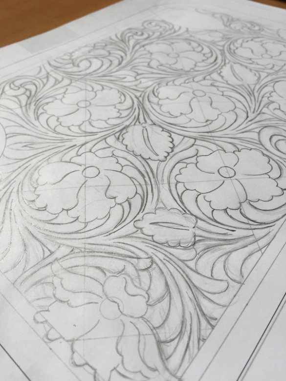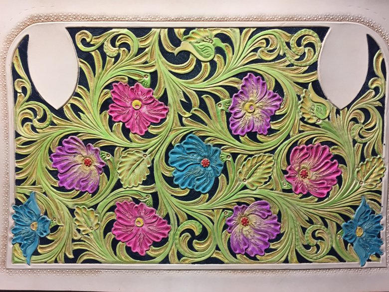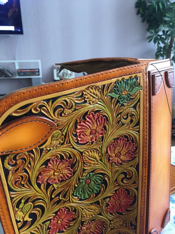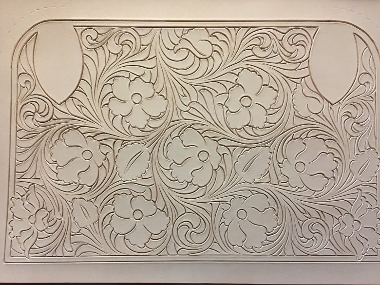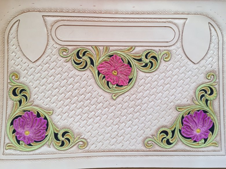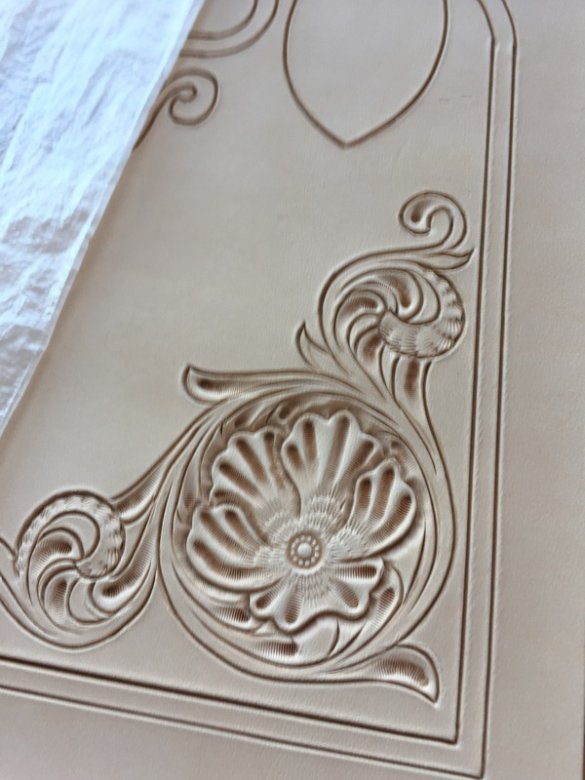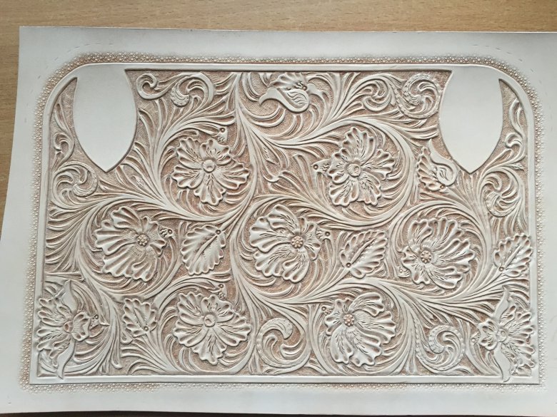 После чего приступаю к тиснению (подробно об этом процессе не буду писать, не о том тема, лишь вкратце основные моменты) клею скотч назад, мочу кожу, перевожу на кожу рисунок, прорезаю по линиям и получаю вот это: