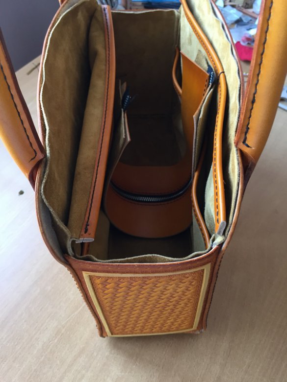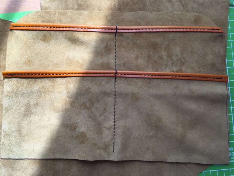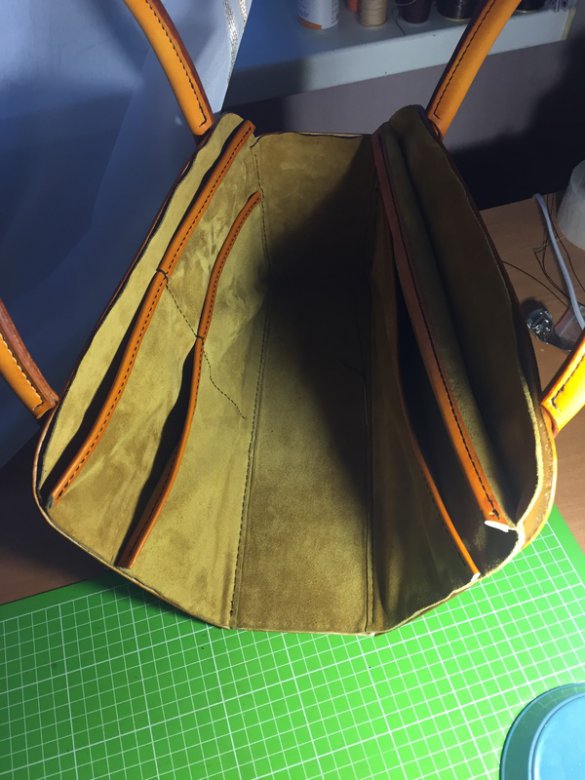 Переходим срочненько к вырезанию подкладки и внутренних карманов, попутно укрепляя верхние части карманов дополнительно кожей путём приклеивания и сшивания их вместе.