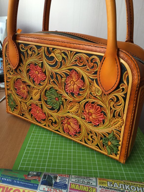 После того как разрисовал узоры, крашу края лицевой и тыльной частей сумки, а также все остальные детали сумки какие то полностью, а какие то только по краю коричневым цветом. Затем провожу манипуляции с антиком лишнее убираю салфеткой и ветошью и покрываю лаком (за фото пардон но как то так).