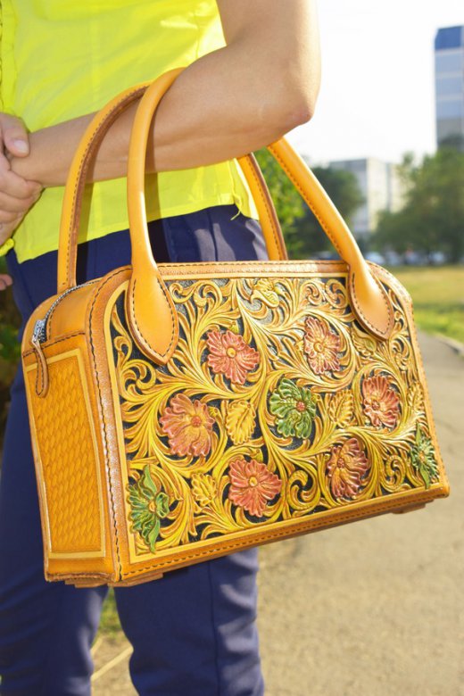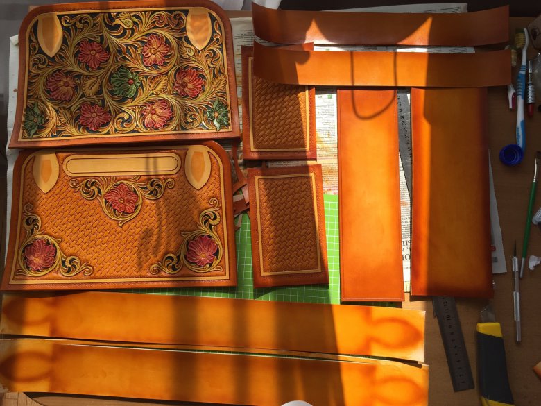 После тиснения вырезаю остальные детали и тесню "сеточку" на торцевых частях сумки, после чего начинаю покраску деталей. И начну я её с покраски фона, а он у нас будет чёрным, после перехожу к покраске узора