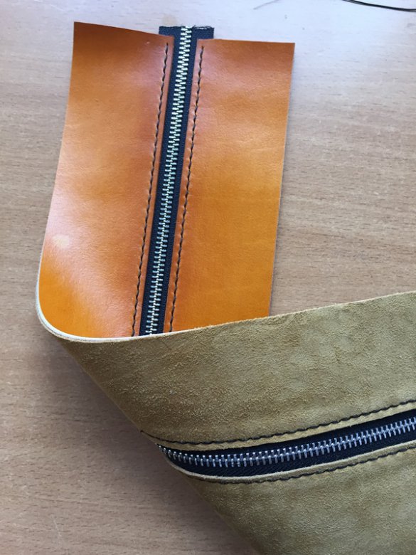Начнём с молнии, тут нет ничего сложного, клеим молнию на своё место с внутренней стороны клеим овал что бы молния не портила общее впечатление и прошиваем.
