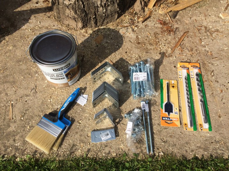 Лес, болты М12, точнее штанга, уголки (понадобилось всего 4), шурупы по дереву два вида, пропитка, свёрла, аксессуары.
