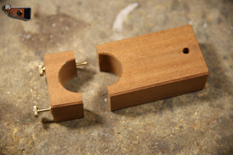 Крепить бутылку решил за горлышко как в стойках для длительного хранения вина в погребах. Для этого сделал стойку с разъёмным зажимом. Отверстие внутри оклеится кожей для предотвращения скольжения.