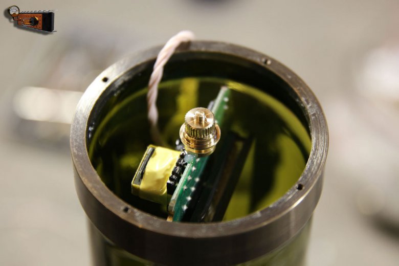 К торцу платы приклеивается винт, который своим шлицем держит край платы и при вращении гайки будет плотно фиксировать и одновременно центрировать плату в бутылке.Дошло дело до подставки. Первоначально я хотел сделать её целиком из дерева пойдя по пути наименьшего сопротивления, но у меня с инструментом по дереву большие напряги. Решил сделать всё у Кирилла, но он, видите ли, домой поехал, у него, блин, выходной… Пришлось мудрить самому, но это, как оказалось, даже к лучшему.
