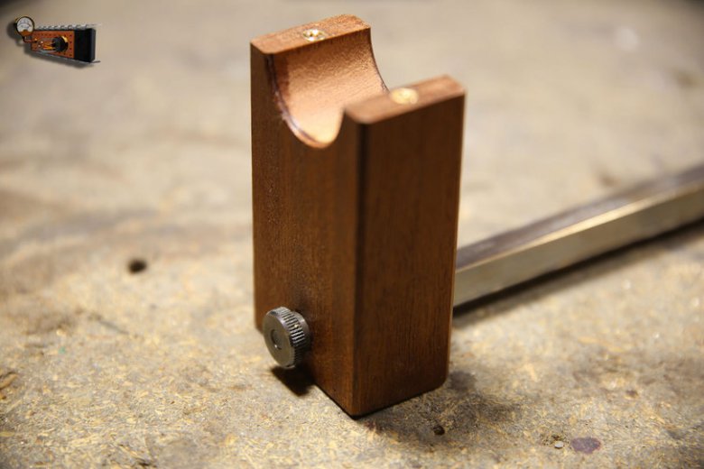 Крепить бутылку решил за горлышко как в стойках для длительного хранения вина в погребах. Для этого сделал стойку с разъёмным зажимом. Отверстие внутри оклеится кожей для предотвращения скольжения.К стойке крепится Т-образная рама из латунного прутка 10Х10 мм.