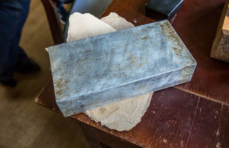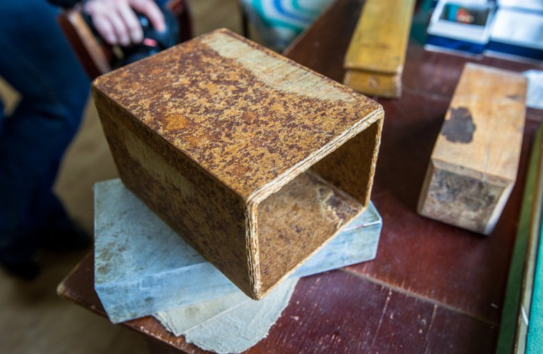 Прессуют, окунают в льняное масло и просушивают. Получается вот такая заготовка, которую нарезают в соответствии с нужными габаритами будущего изделия, а также полируют и чистят пемзой, чтобы на поверхность лучше легла краска.