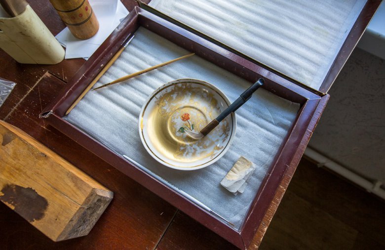 Последней идёт золотая роспись. Листок золота (23 карат) крошат и перемешивают с клеем. Потом этой смесью рисуют, как краской