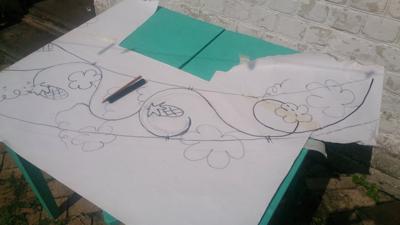 На обрезках обоев был изготовлен (моей сестрой, за что ей безграничный респект) эскиз будущего узора