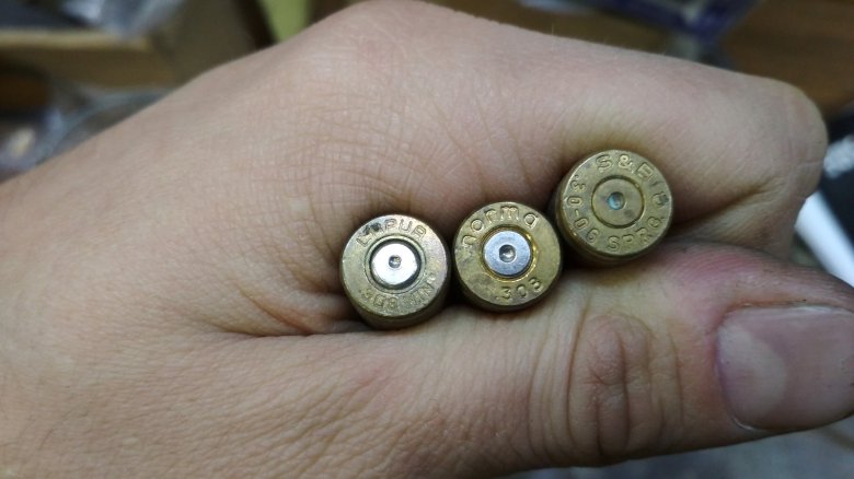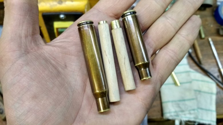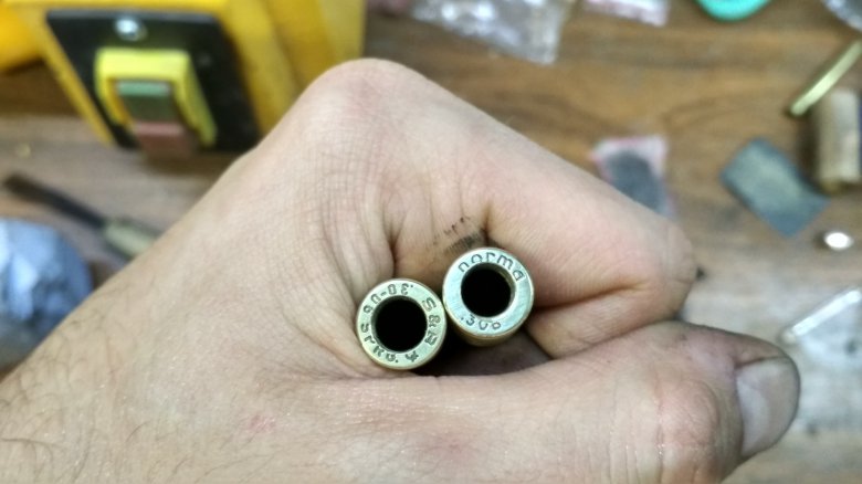 Итак, берем подходящие гильзы. У меня было 2 гильзы 308 и одна 3006, которая просто немного длиннее. Красивые латунные стреляные гильзы калибра 7,62.