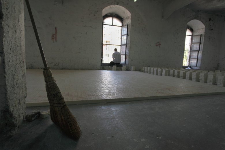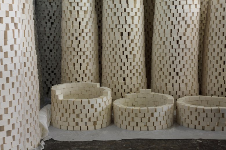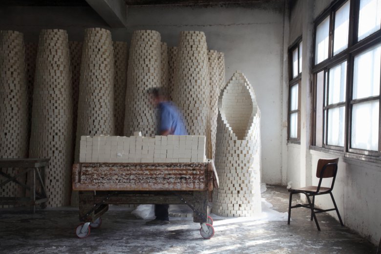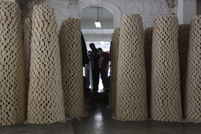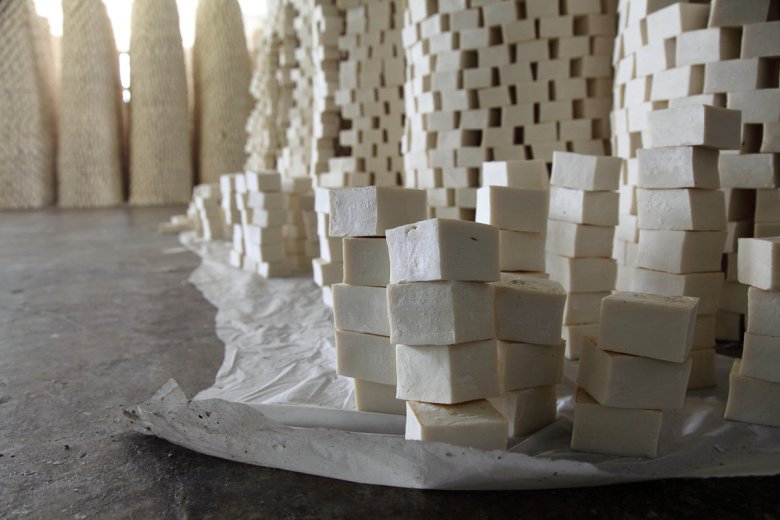 После разрезания мыло укладывают в небольшие прямоугольные башни и оставляют рядом с большими арочными окнами для следующего этапа процесса сушки.