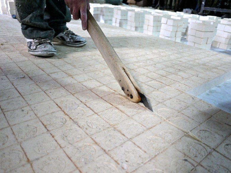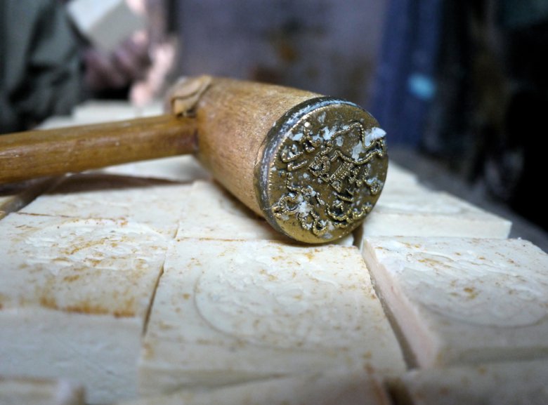 После приготовления жидкое мыло выливают непосредственно на холодный каменный пол фабрики и оставляют охлаждаться. По мере затвердевания, мыло режется специальным ножом, чтобы получить одинаковые бруски мыла. После чего каждый брусок штампуется эмблемой семьи.