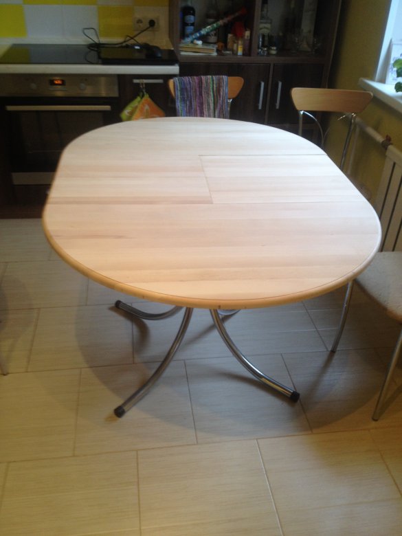 Ножки взял от старого стола, благо диаметр делал такой же. Так вот он выглядит в раздвинутом состоянии. Сознательно упустил моменты шлифовки, там все стандартно: шлифмашинкой от Р60 до Р320.
