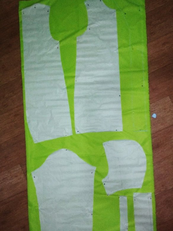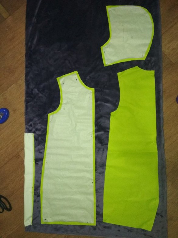 Все начинается с раскроя. Детали распологаем на ткани, скалываем и вырезаем. Это ткань верха-мембрана, подклад-французский мех вельбоа, утеплитель Альполюкс 200, на температуру до -35 градусов. Обязательно нужно придерживаться долевой линии, чтобы изделие не перекосило на человеке.