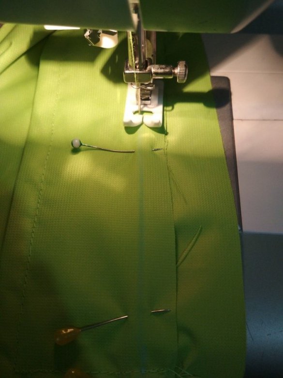 Сшиваю подкладку с тканью верха. Пришиваю ветрозащитную планку, вшиваю молнию, пробиваю дырки и вставляю кнопки ручным прессом.
