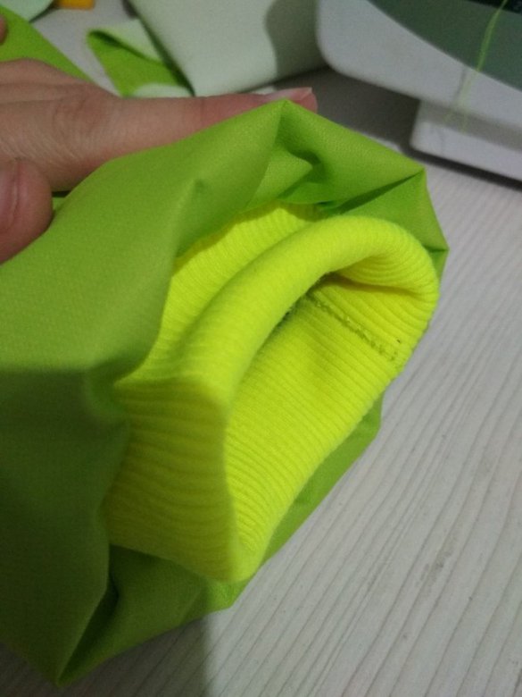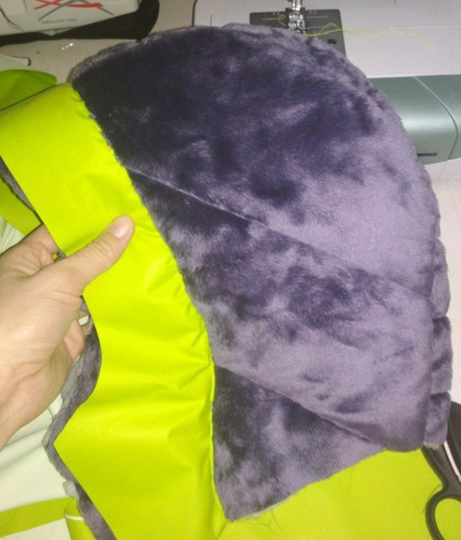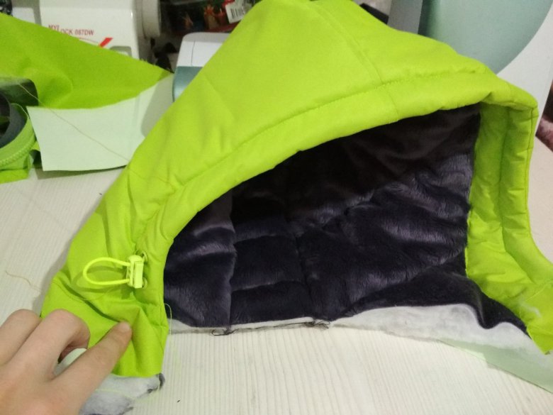 Капюшон готов полностью. Сшила подкладку с тканью верха, продела резинку для утяжки капюшона. Сделала двойные манжеты в рукава.