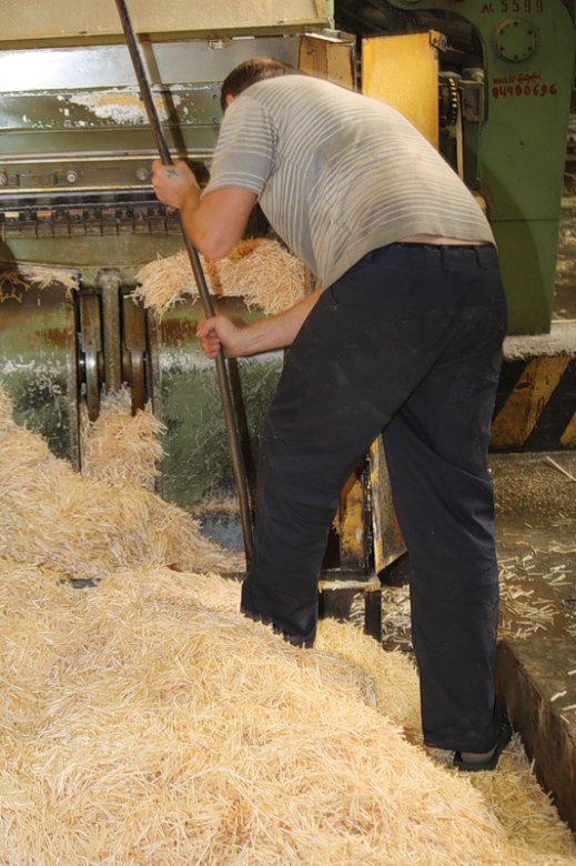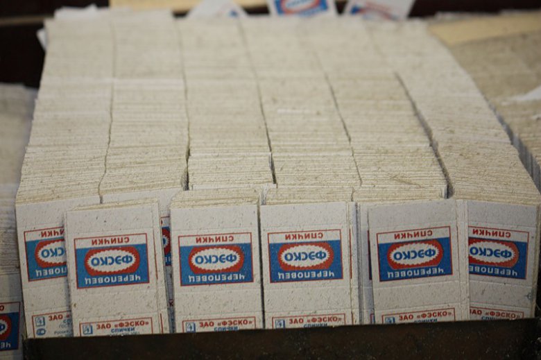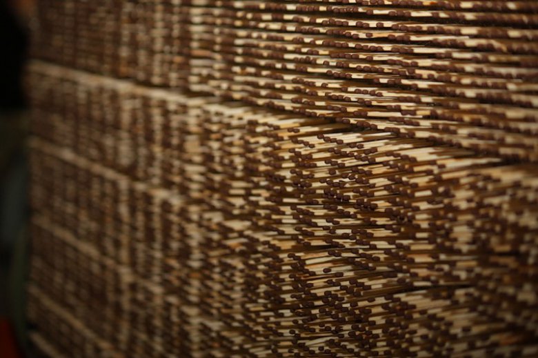 Остальные заготовки идут в дальнейшее производство спичек - в химические цеха (куда меня из соображений безопасности не пустили). Там спичечные палочки пропитывают ортофосфорной кислотой, а после парафинируют, чтобы они не портились (все, кто грызет спичку — срочно её выплюнули). Потом заготовку окунают в серный раствор, чтобы получились спичечные головки.