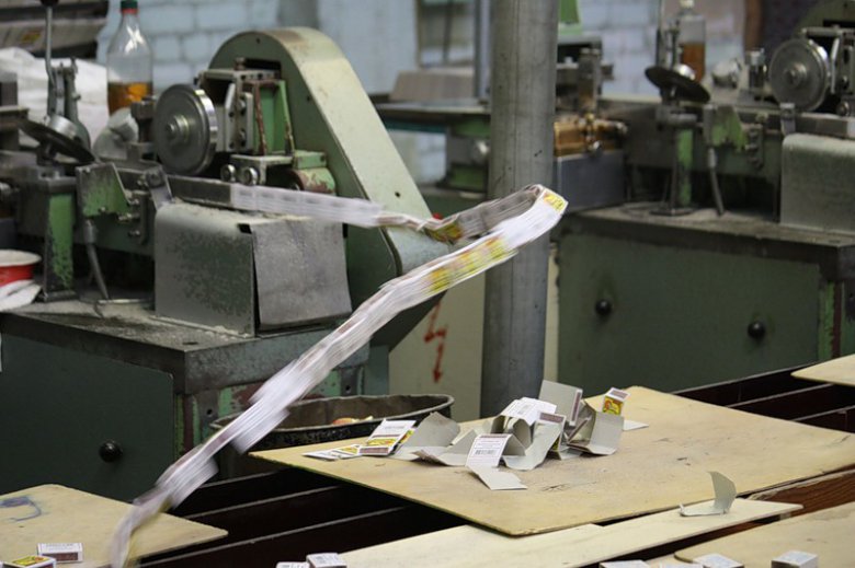 Пока спички сохнут, в другом цеху изготавливают спичечные коробки. На картоне из огромных рулонов печатают рисунок, «тёрку—чиркалку» наносят там же, следующим этапом.