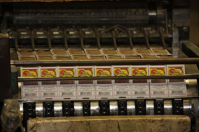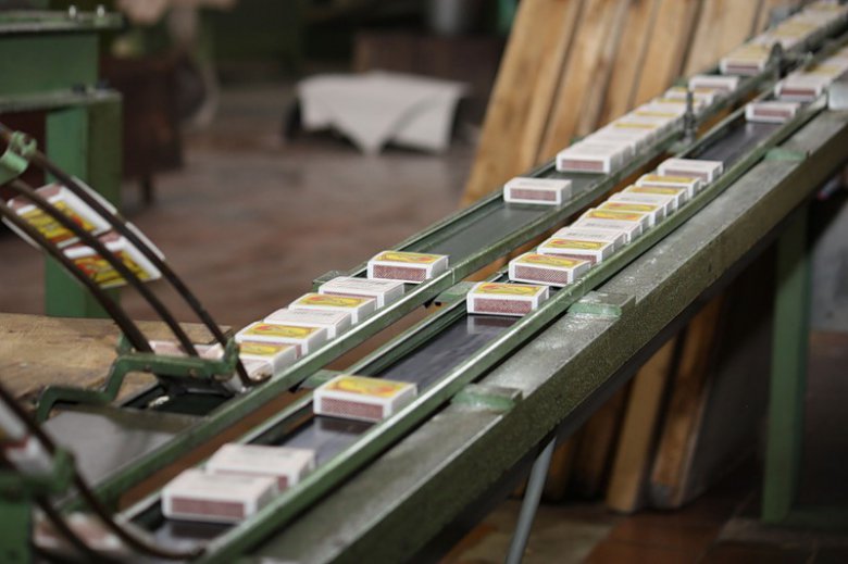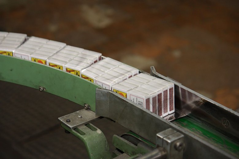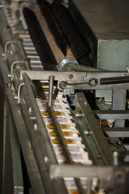 Дальше идет наполнение коробков. Интересно, что в советское время в коробке было примерно 60 спичек, в России уже клали в коробок по 50 спичек, после кризиса стало около 40 (это мне напомнило упаковки с крупой в магазине по 900 грамм — вроде и пачка целая, а цена как за килограмм).