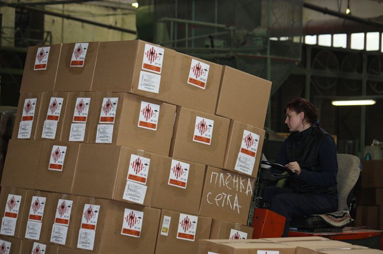Интересно, что большинство работников в цехах — это женщины и молодежь. И повсеместно видны остатки былого советского прошлого — агитационные плакаты и лозунги, кое-где переделанные под современные (как на фото ниже, флаг СССР двумя штрихами изменен под российский триколор).