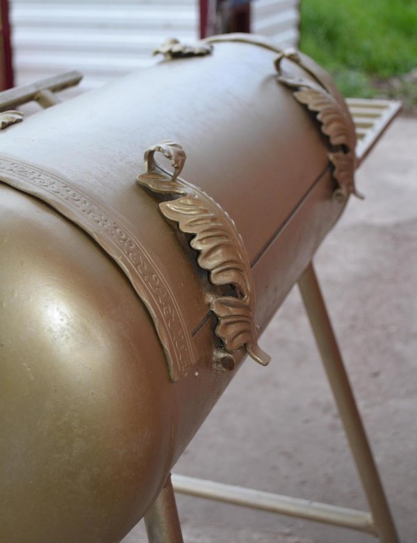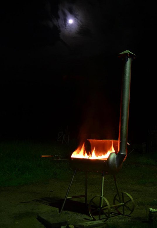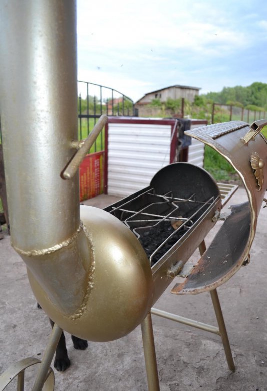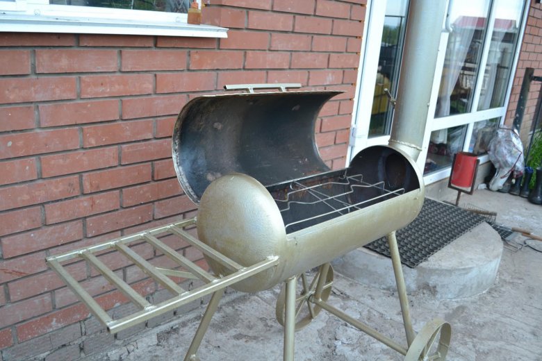 Встала необходимость в приобретении мангала, в то-же время под ногами валялся старый баллон на 50 л. из под газа. Решение принял быстро. Открутил вентиль, наполнил водой, просверлил отверстия под подув, потом сделал пропилы. На все про все ушел день работы и 300 руб всяких железячек с ближайшего рынка. Колеса выполнены на осях, крутятся как положено. Покрасил краской БТ 117 и вечером прожег все как следует. Мангал делал в 2015 году. Показал себя на отлично. В него как раз помещается две решетки и крышка при этом закрывается, томить мясо очень удобно. Сталь мангала очень хорошая, мангал эксплуатируется каждую неделю, на прогорания даже намека нет, никуда не ведет, ничего не коробит. Не мангал а песня!