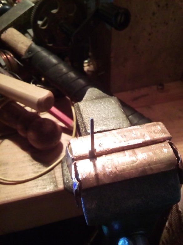 Вставляем клинок в тиски и зажимаем. Медные накладки нужны чтобы не повредить металл.