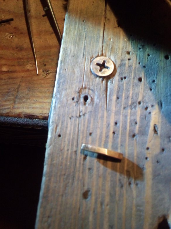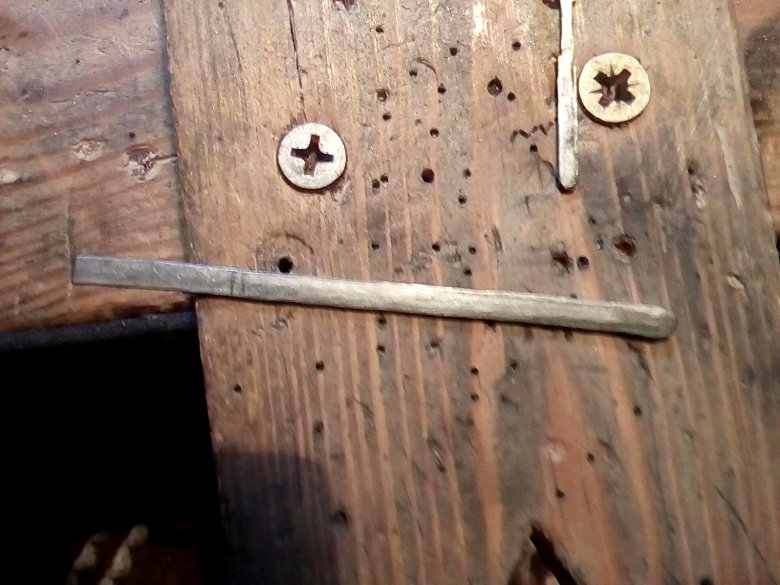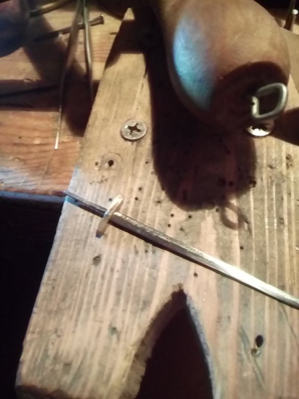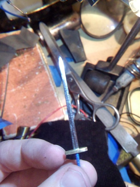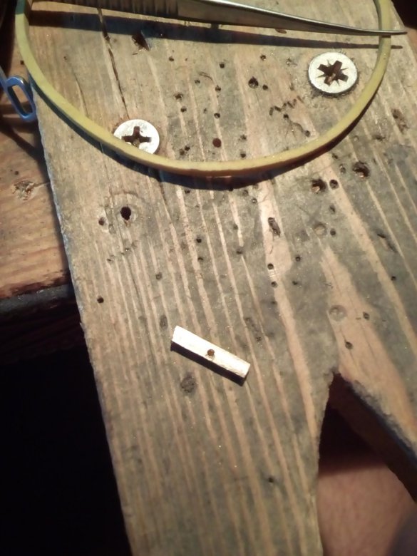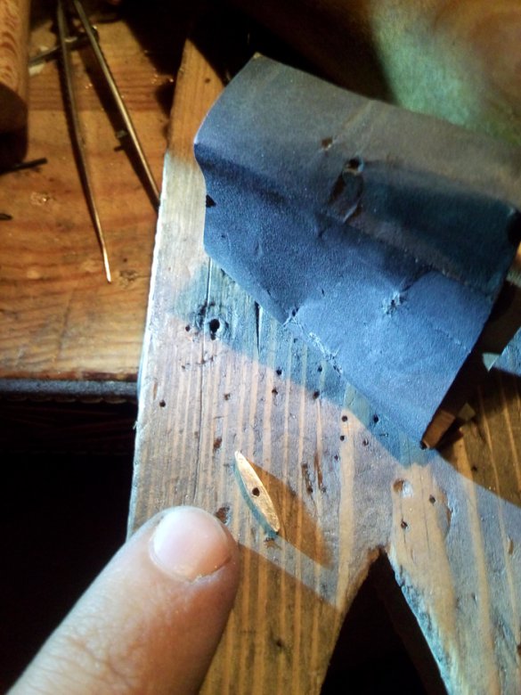 Отрезаем кусочек латунной проволоки и сверлим дырочку под клинок. Косяк в том, что надо было сначала выпилить прорезь, а потом отрезать. Если сделать наоборот(как я и сделал), то выпиливать паз очень неудобно.