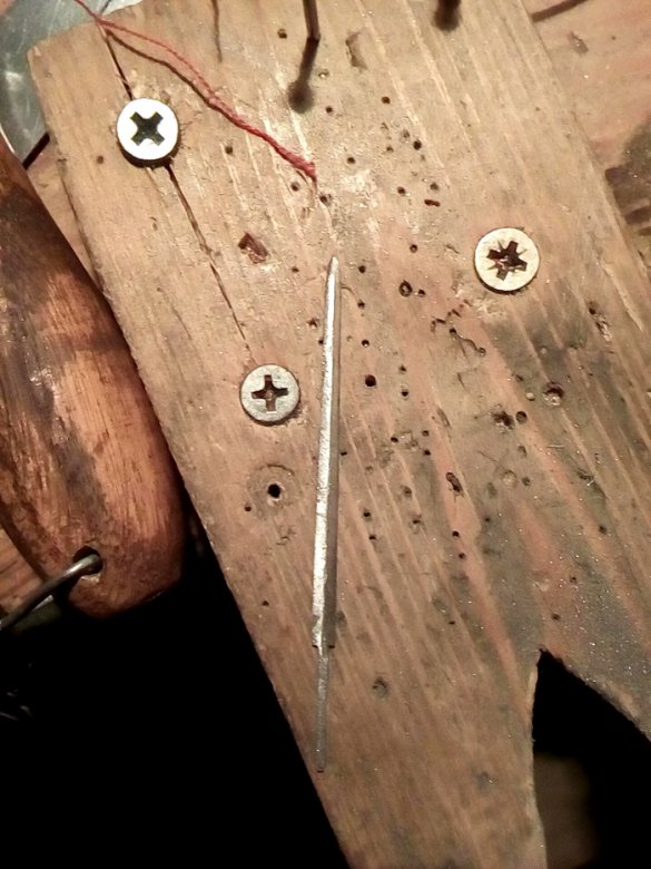 Рукоять обмотана ниткой, а её конец продет в яблоко, после чего рукоять была вбита в яблоко. Меч готов.