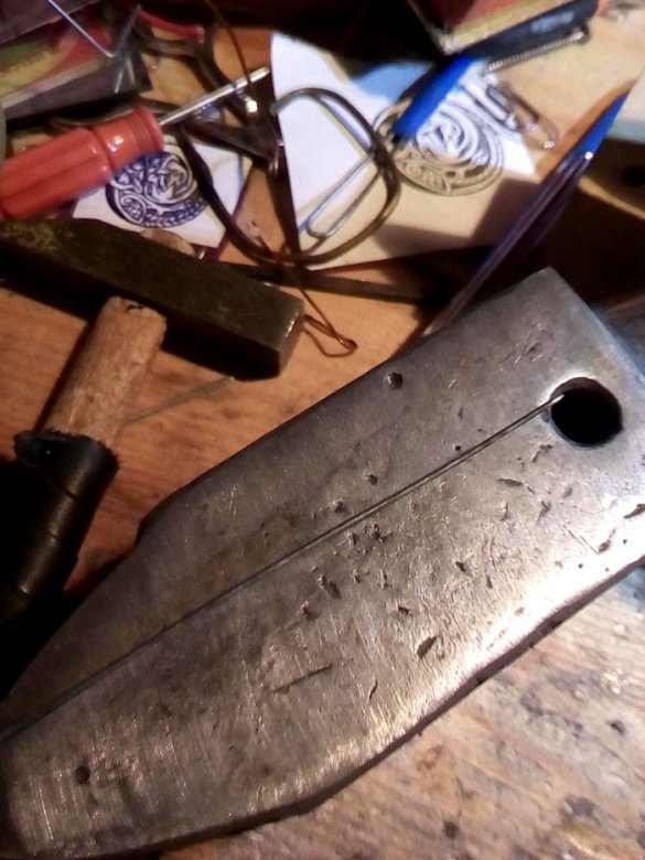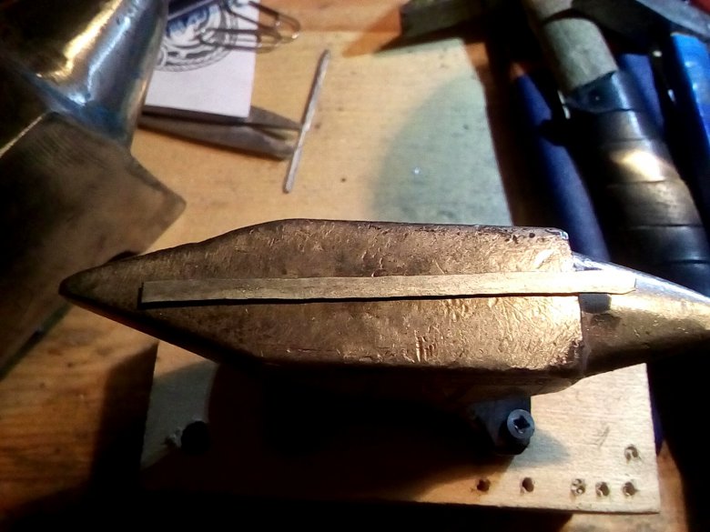 Здесь я уже обточил гарду до примерной формы и сделал паз - слишком маленький, как потом оказалось. Пришлось дважды расширять.