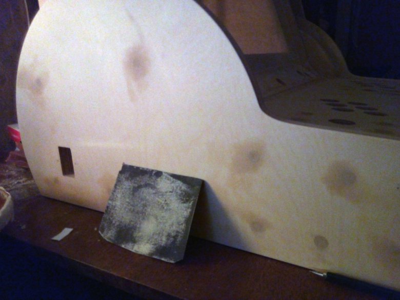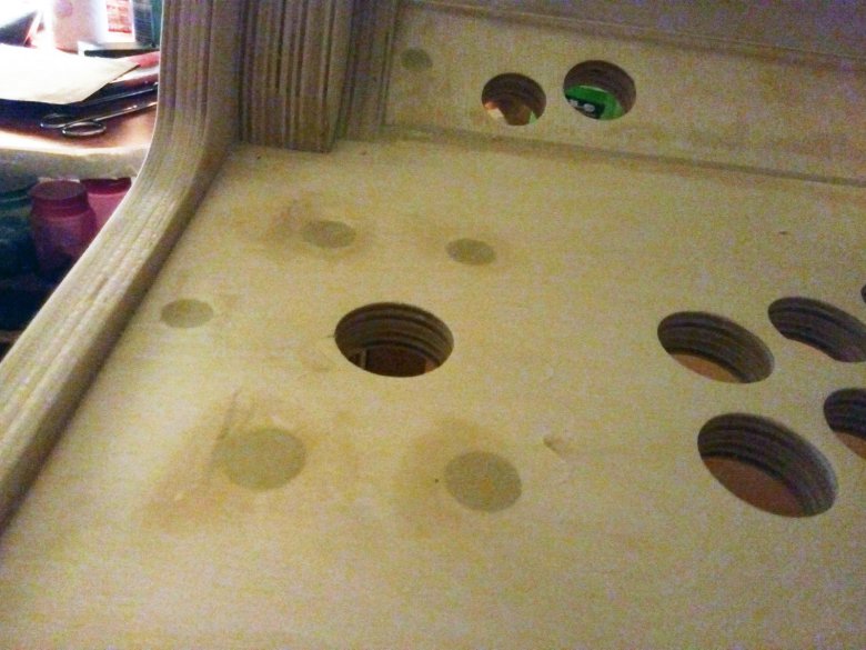 От этого момента мне пришлось ждать около недели, чтобы продолжить работу, отчего я напрочь забыл про камеру. Перед покраской нужно нанести на дерево воду с разведенным в ней ПВА клеем, чтобы ворс (который был приглажен наждачкой) встал и затвердел. После этого мы снимаем его той же наждачкой. Если этого не сделать, то деревяха будет грубая и шершавая. Если лень этим заниматься, то лучше сразу взять ДСП.