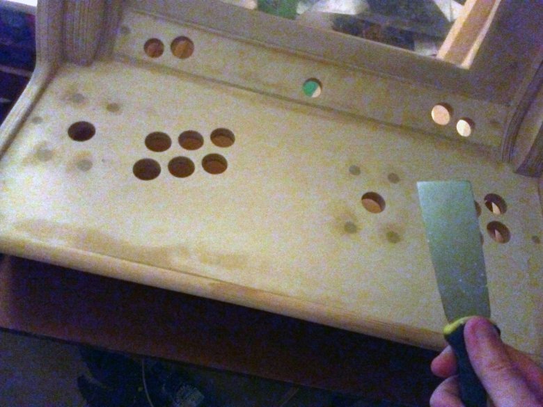 Делаем дырки под болты для джойстиков. Утапливаем их поглубже и заливаем клеем, чтобы не вращались.