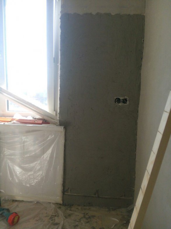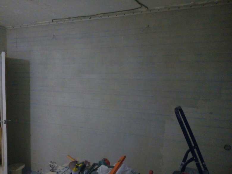 Далее заштукатурил стены. Сначала прошелся грунтовкой, затем ротбанд.
