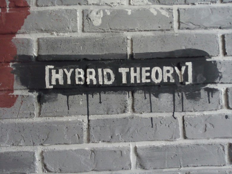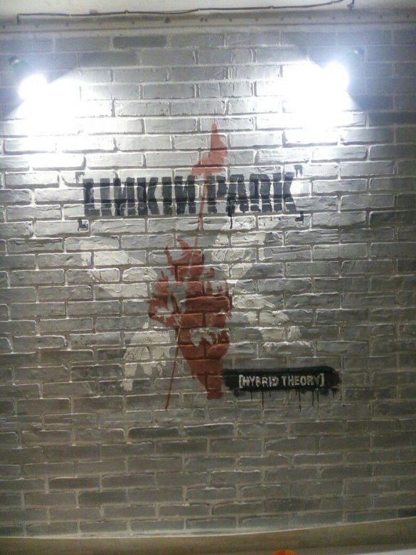 Далее шаблон удалил и подкрашивал фрагменты на тонкой кистью для рисования. После подсыхания так же шаблоном сделал надпись "Linkin Park". Накалякал черной краской фон для надписи "hybrid theory". Для подтеков сделал краску пожиже (добавил воды).