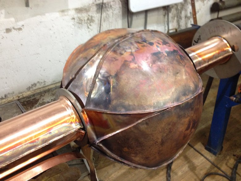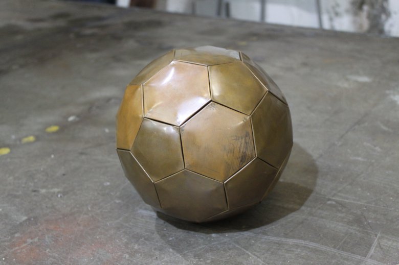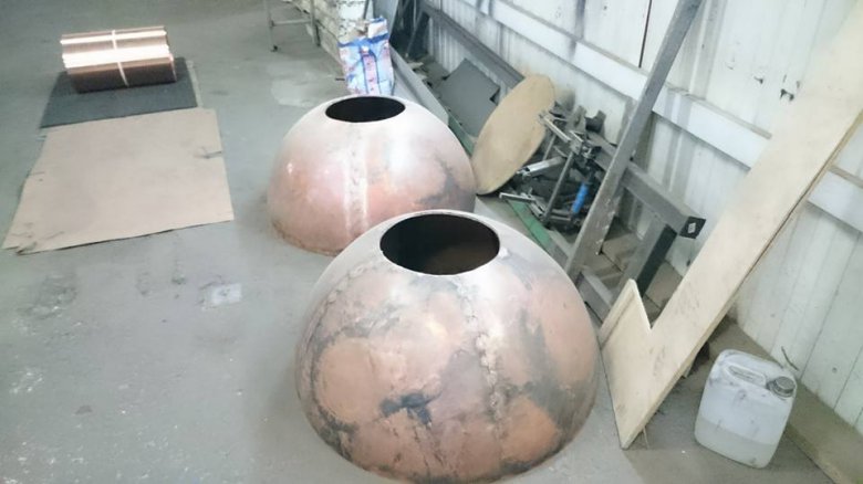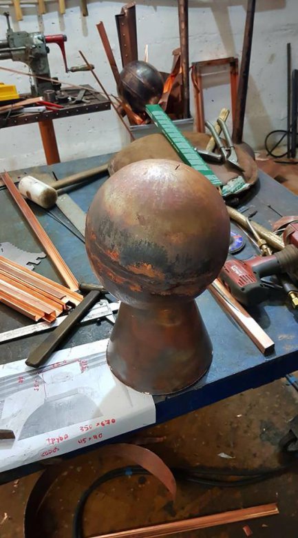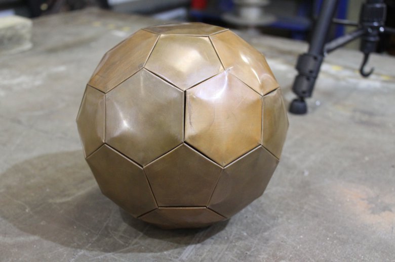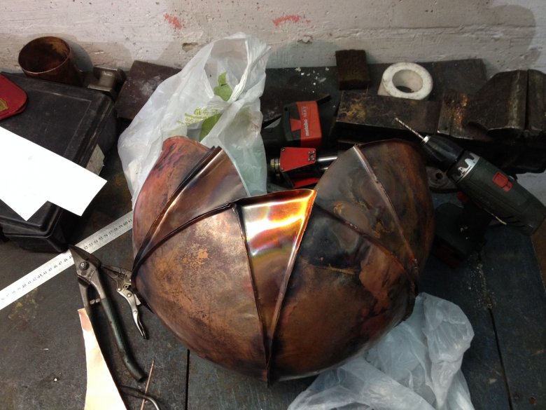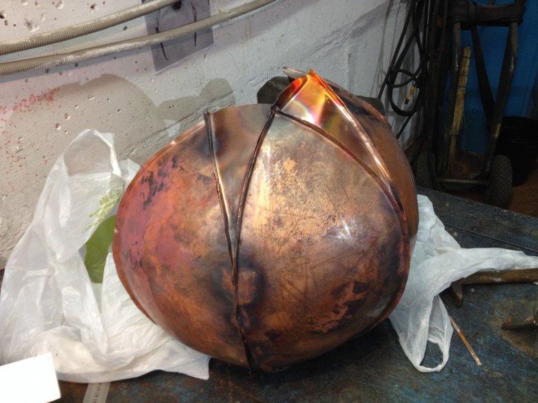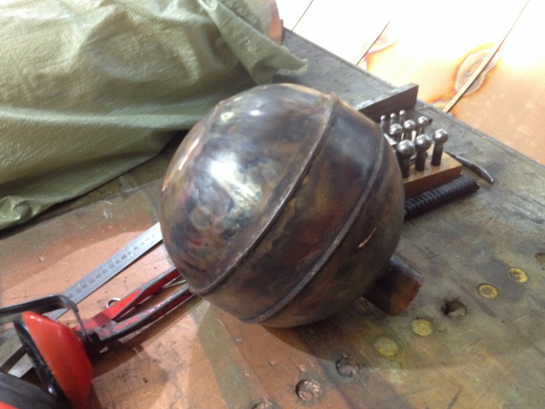 Вот так, обстукивая и прокатывая сводим две половинки нашей будущей сферы. Потом шов спаивается.