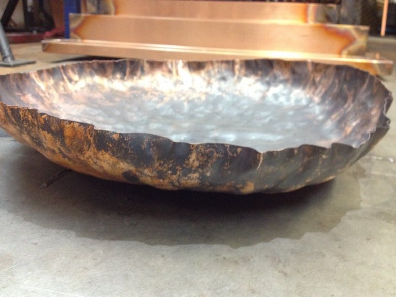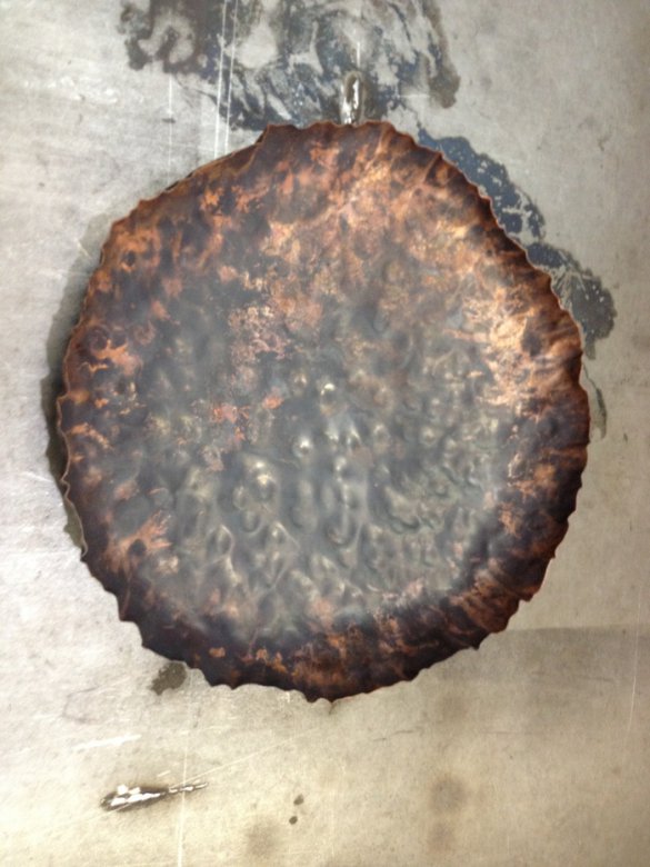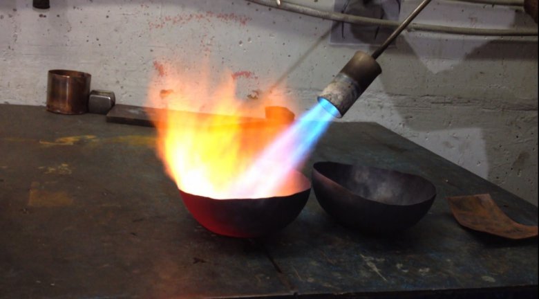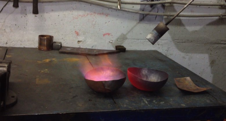 Как только медь под молотком начинает звенеть, её необходимо отжигать, так как от ударов молекулярная структура меняется и она становится слишком твердой, что бы с ней работать. Отжигание (отпуск) снимает напряжение металла, делая медь пластичной.