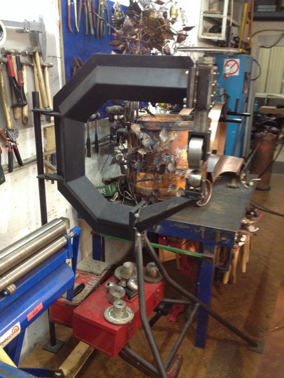 Суть в том, что мы катаем нашу заготовку между вальцами английского колеса. На красном ящике внизу различные вальцы, для разных радиусов.