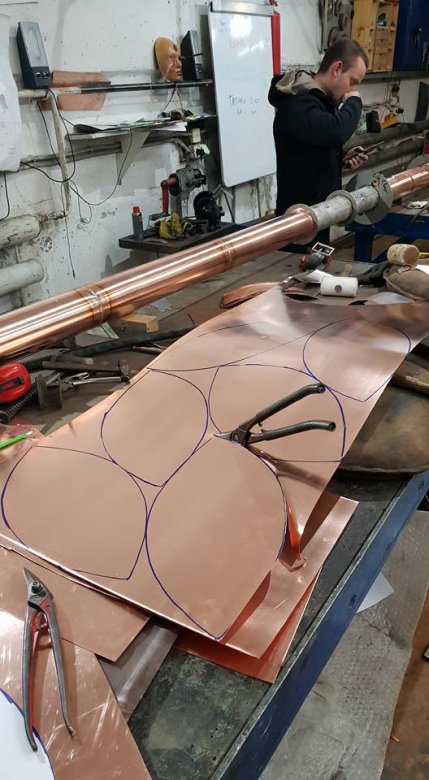 Вырезаем их, отжигаем, задаем радиус на вальцах, делаем отгибки и стыкуем между собой. Там где лепестки начинают расходиться добавляем треугольные вставки.