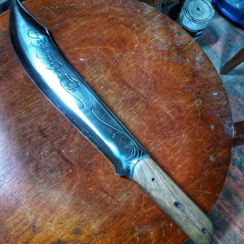 Гравировка с обеих сторон клинка одинаковая, ну почти одинаковая, я старался. Для закалки пришлось найти трубу приличного диаметра и заполнить ее маслом, чтобы целиком погрузить изделие. Отпуск производил дома в духовке при 200 градусах в течение часа.