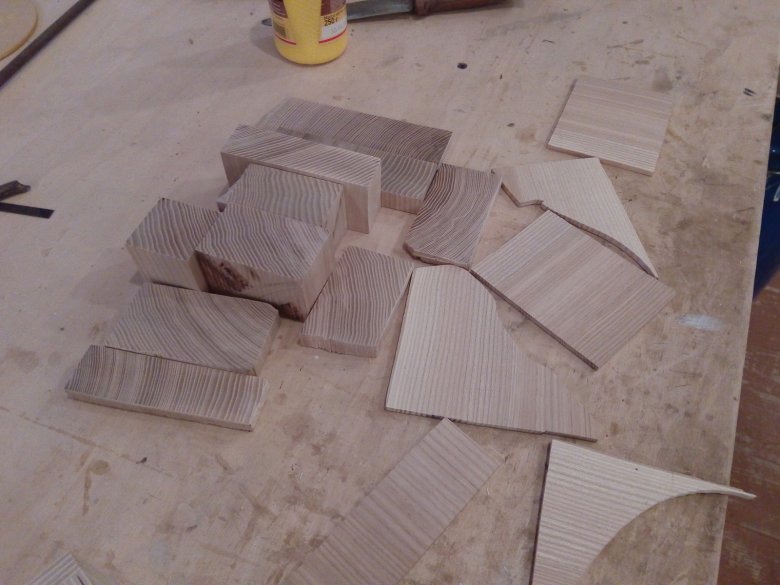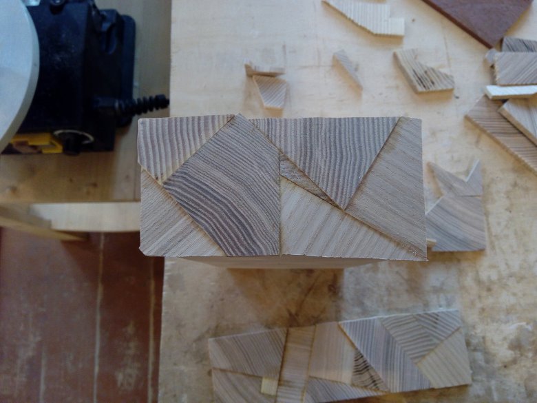 Значит пойдем по другому пути. Сначала склеим щитки в торец, а уже потом приклеим щитки к заготовке. Так получилось гораздо проще и лучше. Хотя щиток тоже деформировался, но прижать его оказалось гораздо проще, чем отдельные детали.
