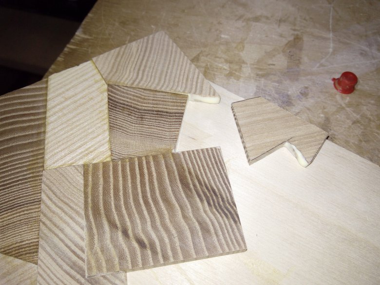 Заготовку для шкатулки делал из фанеры 10мм. Сначала попробовал приклеивать спилы сразу на заготовку. И столкнулся с проблемой. Спилы от клея начинают сильно деформироваться, изгибаться, и приклеить их нормально можно только под прессом, но клеить каждый кусочек отдельно, прижимать и ждать пока приклеится очень долго. Не вариант.